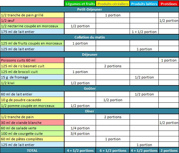 Voici ce à quoi ressemble une portion du guide alimentaire. Voici les types d'aliments qui devraient composer un repas. Maison) sont à consommer à raison d'une portion par repas, . Produits céréaliers et leur dérivés. ¾ de tasse (175 ml) = 1 poing.